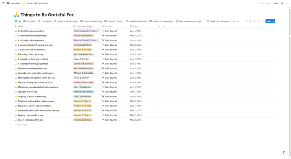 - Linked Gratitude database with weekly/monthly/yearly rollups
